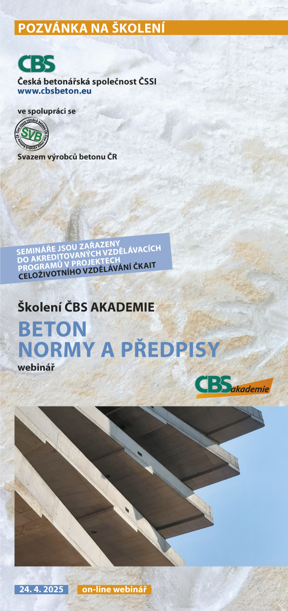 Webinář volně navazuje na cyklus 4 online webinářů ČBS Akademie „BETON A NORMY“ vysílaného v březnu 2022. Obsah webináře je zaměřen především na systematický přehled aktuálně platných, harmonizovaných a určených standardů a dalších předpisů pro betonové konstrukce. Důraz je kladen na i informace o novinkách v této oblasti. Pro přihlášení využívejte výhradně on-line přihlašovací formulář na webové stránce ČBS.